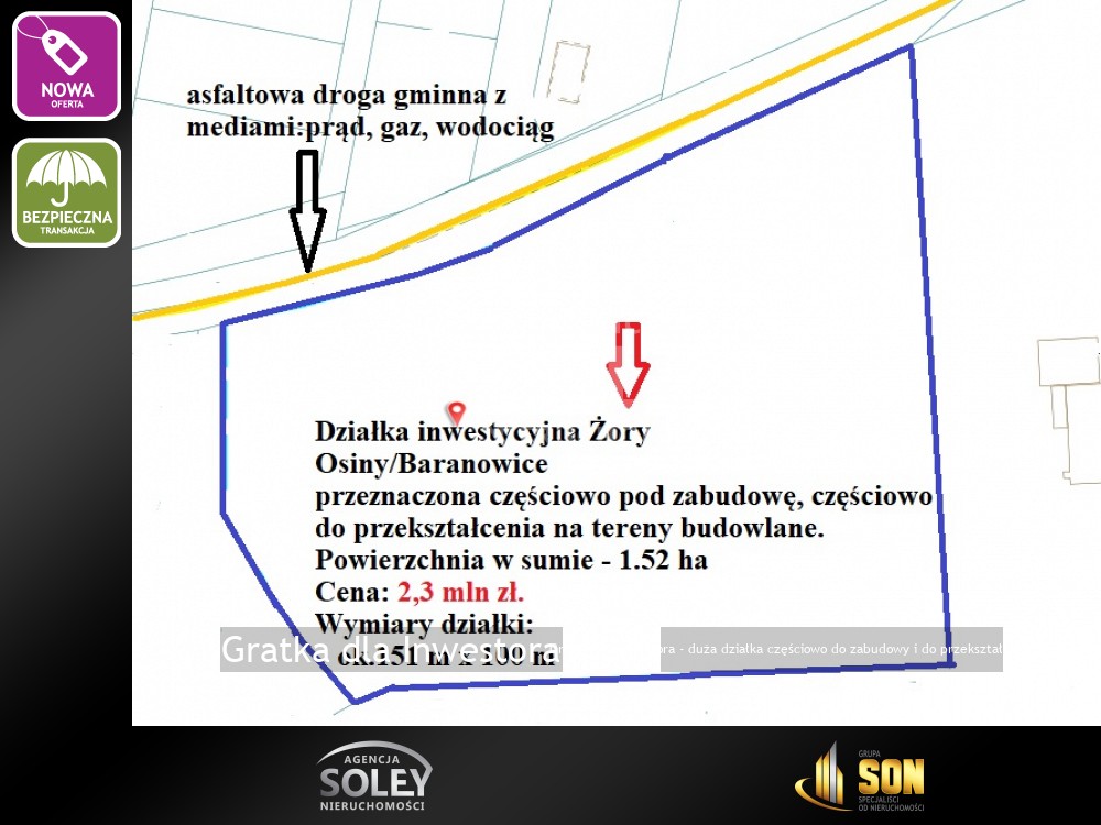 Oferujemy do sprzedaży działkę, położoną w Żorach, Osiny / Baranowice, o powierzchni 1.52 ha.