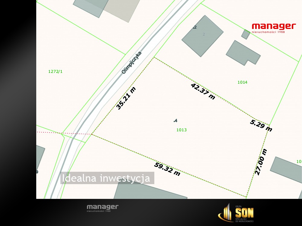 Nieruchomość gruntowa posiada wymiary: ok. 35 m szerokości i ok. 59 m długości, o równomiernym kształcie.