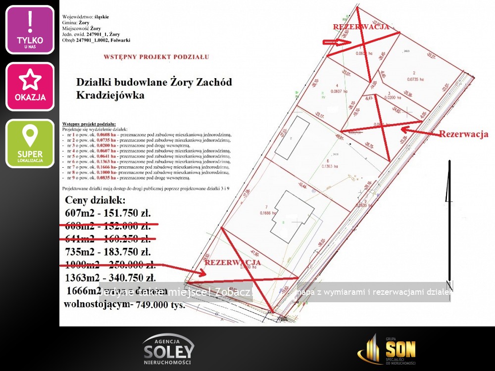 Powierzchnie pozostałych działek: ok.607 m2, ok.1363 m2.