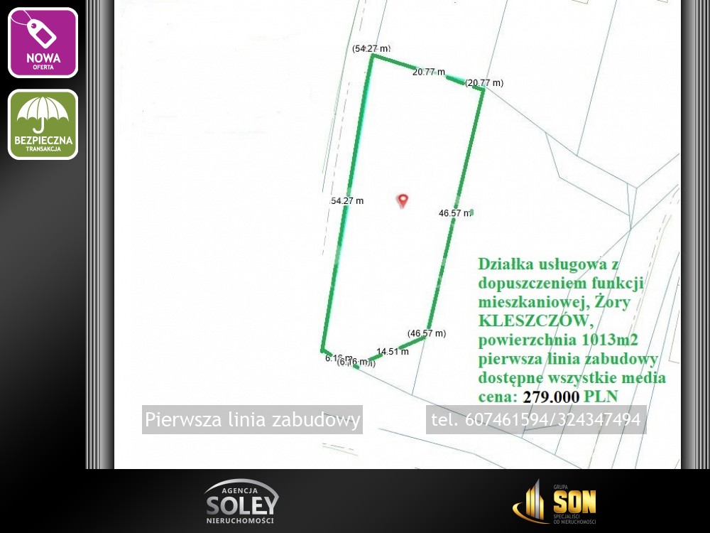 Oferujemy do sprzedaży dobrze usytuowaną działkę usługową (z możliwością funkcji mieszkalnej) w Żorach, Kleszczów.